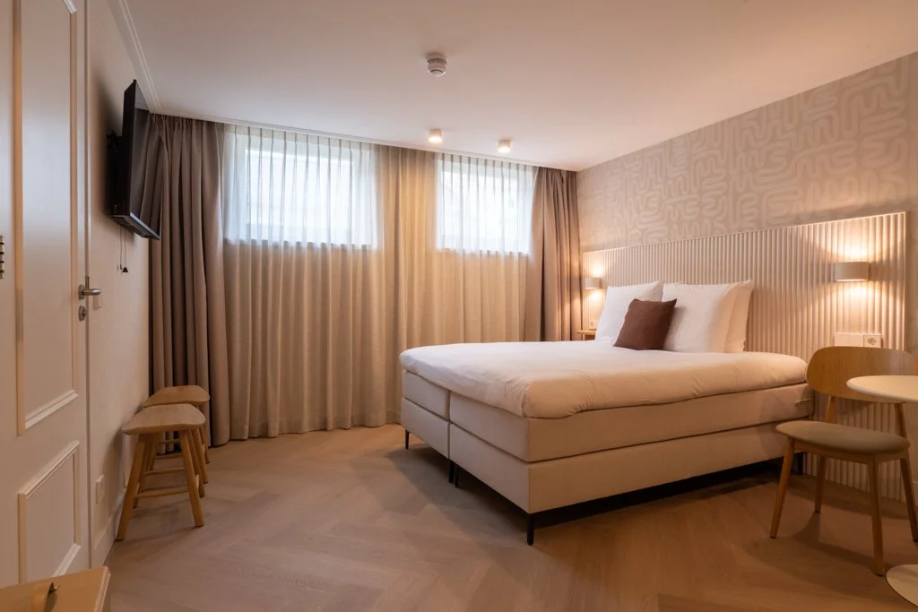 Die Suite verfügt über eine Pantry, ideal für eine leichte Mahlzeit oder ein Getränk. Das elegante Terrazzo-Badezimmer macht diese Suite zu einem komfortablen und einladenden Ort, um nach einem Tag am Meer oder einem Spaziergang durch Scheveningen zu entspannen.