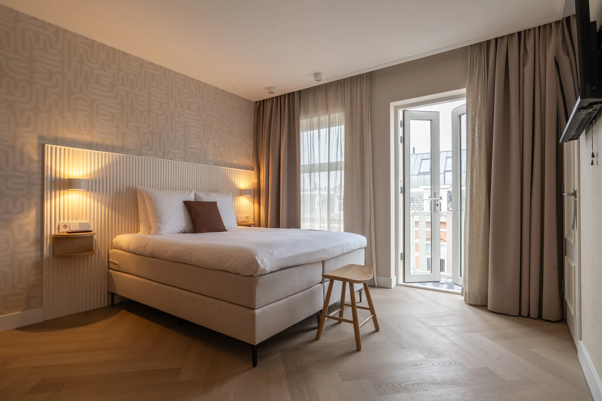 The Family Room is furnished with a queen bed and two single bunk beds, while the adjacent Double Room features a queen bed and a kitchenette with a combi oven and stovetop for preparing simple meals. From one of the rooms, there is access to a private balcony or terrace. The elegant terrazzo bathrooms and warm, natural materials make the 6-Person Family Room a comfortable and inviting place for families to unwind after a day by the sea or a stroll through Scheveningen.